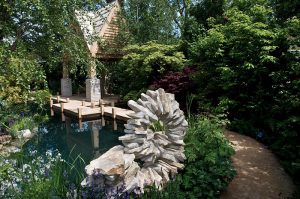 Steel sculpture designed by Jo Thompson winding along the River Derwent at RHS Chatsworth Flower Show Embracing the majestic setting of Chatsworth House, Jo’s garden…